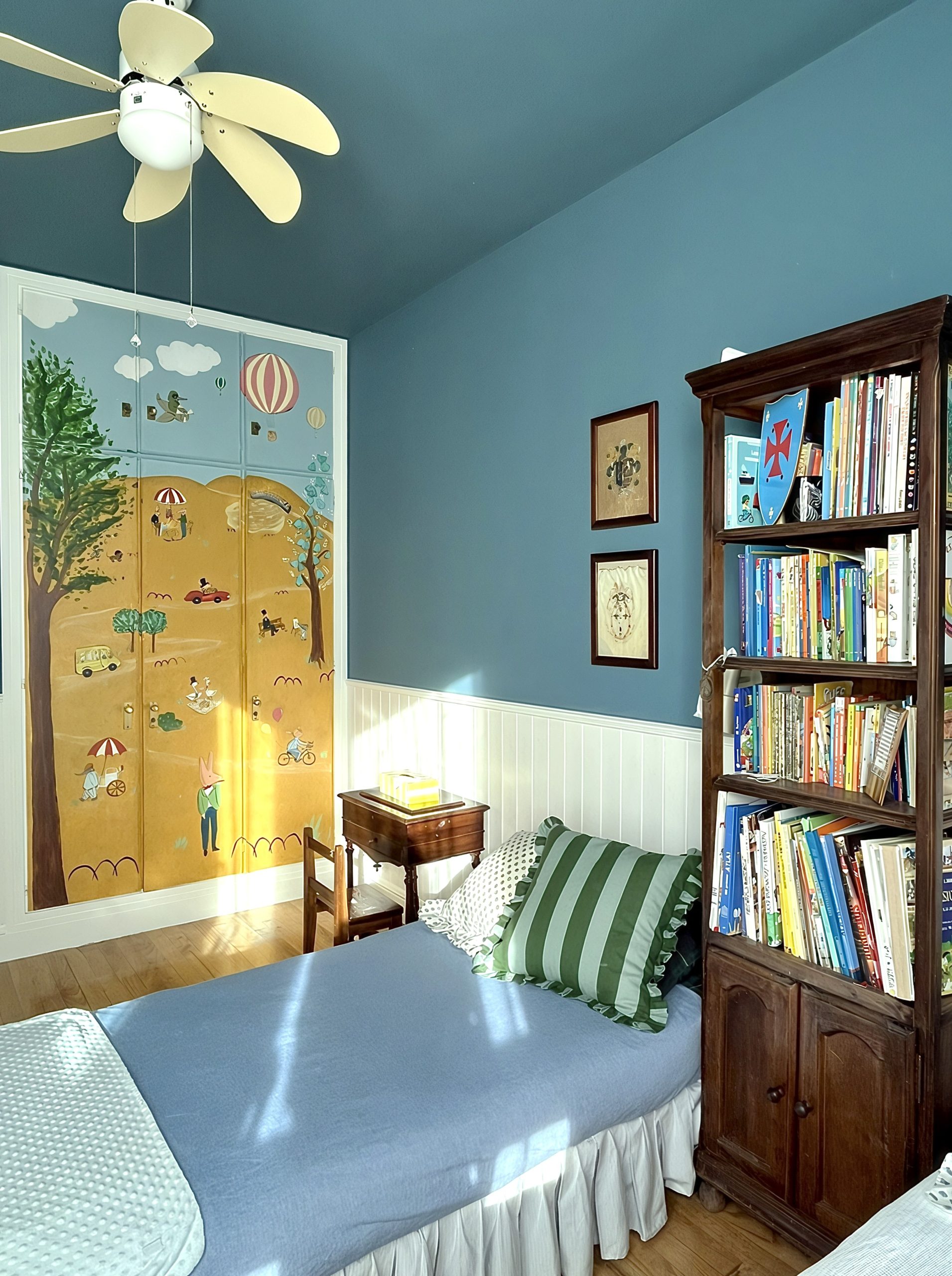 La luz entra suave y dibuja sombras sobre la colcha, los libros esperan pacientes en la estantería y, en las puertas del armario, los personajes pintados parecen tener vida propia, como si en cualquier momento fueran a salir a jugar. Es un espacio pensado para soñar despiertos: leer, inventar mundos, descansar… Un lugar donde cada detalle invita a la calma y a la imaginación.
